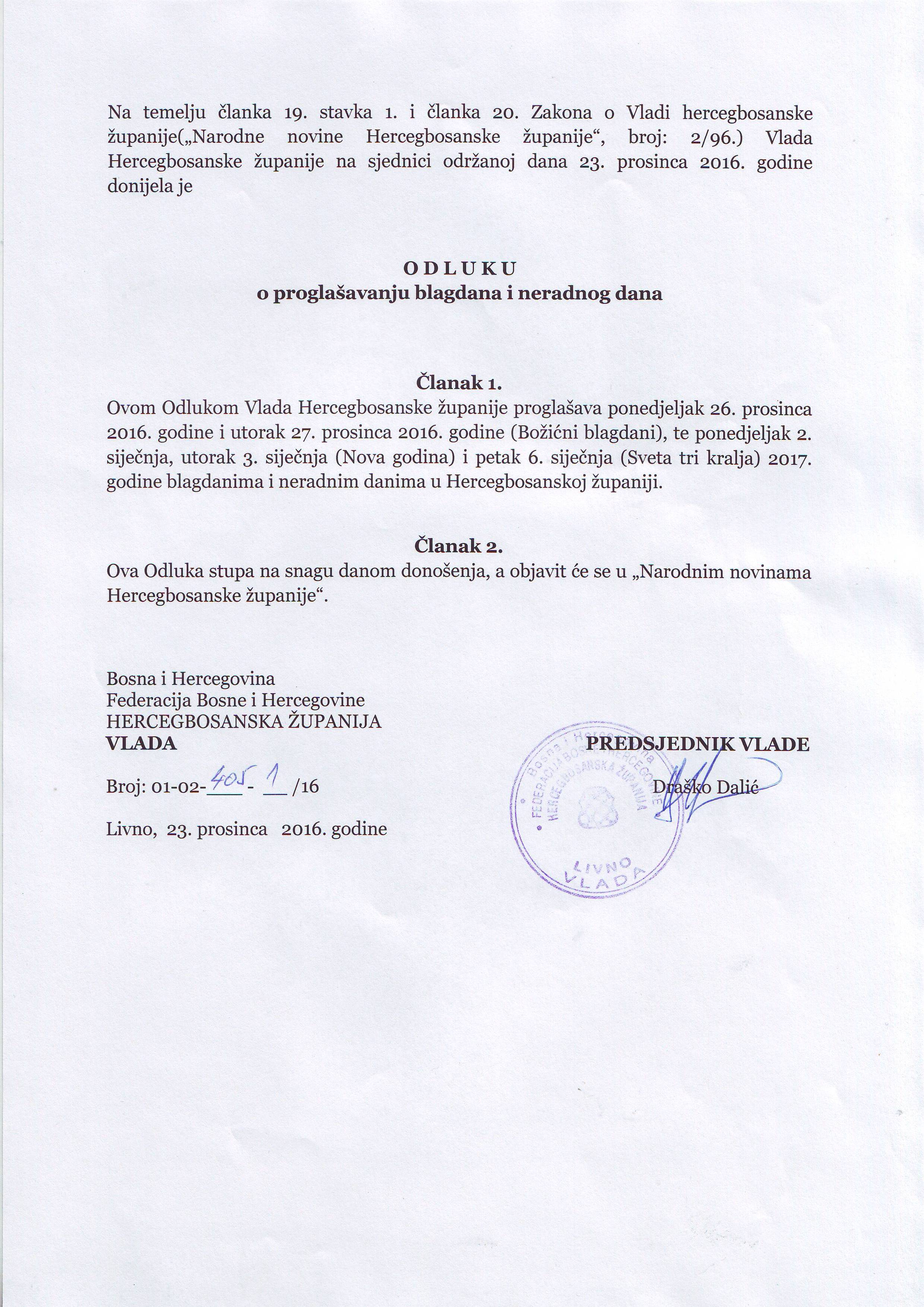 Ovom Odlukom Vlada Hercegbosanske županije proglašava ponedjeljak 26. prosinca 2016. godine i utorak 27. prosinca 2016. godine (Božićni blagdani), te ponedjeljak 2. siječnja, utorak 3. siječnja (Nova godina) i petak 6. siječnja (Sveta tri kralja) 2017. godine blagdanima i neradnim danima u Hercegbosanskoj županiji.